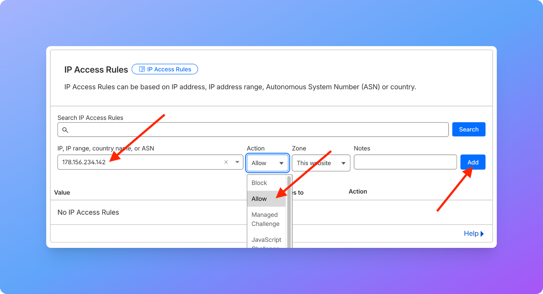 In this section, you’ll see a field labeled “IP, IP range, country name, or ASN.” Enter the GoPublish IP Address 178.156.234.142 in the input box. Next, from the Action dropdown, select Allow. Next, under Zone, select: